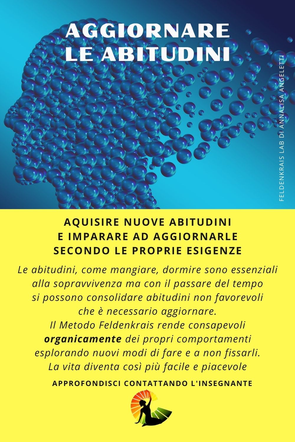 Acquisire nuove abitudini e imparare ad aggiornarle. Le abitudini, come mangiare, dormire sono essenziali alla sopravvivenza ma con il passare del tempo si possono consolidare abitudini non favorevoli che è necessario aggiornare. Il Metodo Feldenkrais rende consapevoli organicamente dei propri comportamenti esplorando nuovi modi di fare e a non fissarli. La vita diventa così più facile e piacevole.