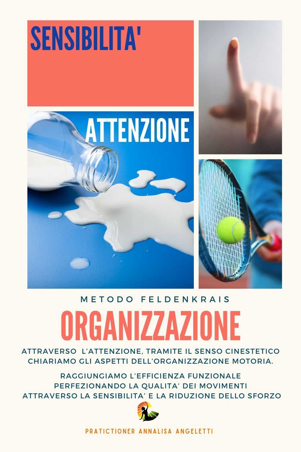 Attraverso l’attenzione, tramite il senso cinestetico chiariamo gli aspetti dell’organizzazione motoria. raggiungiamo l‘efficienza funzionale perfezionando la qualità dei movimenti attraverso la sensibilità e la riduzione dello sforzo.
