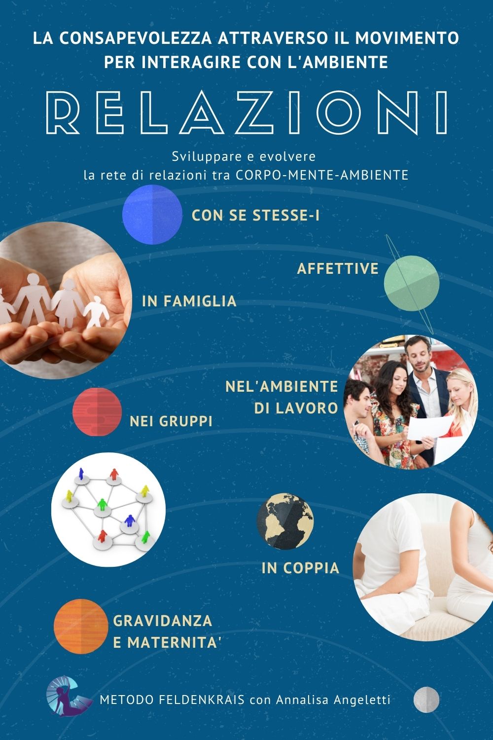 Praticare il Metodo Feldenkrais è utile per sviluppare corpo-mente-ambiente in una rete di relazioni: con se stesse- stessi, affettive, in coppia, in famiglia, nei gruppi, nell’ambiente di lavoro, in particolari fasi della vita come gravidanza e maternità.