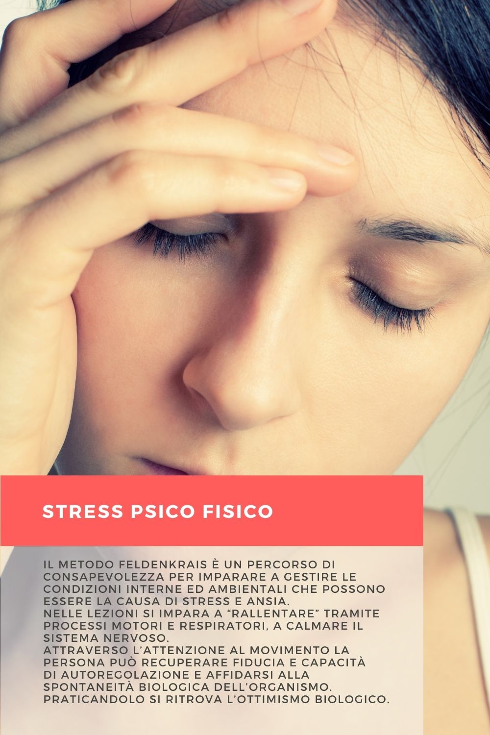 Stress psicofisico. Il Metodo Feldenkrais è un percorso di consapevolezza per imparare a gestire le condizioni interne ed ambientali che possono essere la causa di stress e ansia. Nelle lezioni si impara a “rallentare” tramite processi motori e respiratori, a calmare il sistema nervoso. Attraverso l’attenzione al movimento la persona può recuperare fiducia e capacità di autoregolazione e affidarsi alla spontaneità biologica dell’organismo. Praticandolo si ritrova l’ottimismo biologico.
